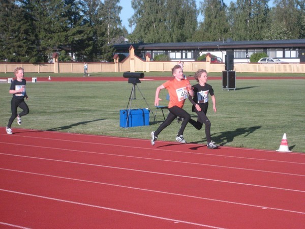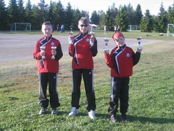 Milja, Teijo ja Vesa kilpailivat torstaina 10.6.2010 laidunkauden avauskisassa Limingassa. Pyhäjoelle tuotiin tuliaisina kaikkiaan kuusi pokaalia. Milja Raitanen voitti T9-sarjan pituushypyn uudella ennätyksellään 368 cm. Kaikki neljä yritystä kantoivat yli 3,5 metrin. Voitto tuli myös 60 m juoksussa ajalla 9,99 s. Teijo Impola sijoittui P11-sarjan pituushypyssä kolmanneksi uudella ennätystuloksella, joka kirjataan nyt lukemin 365 cm. Lisäksi Teijo sai pronssia 11-vuotiaiden poikien 600 m kestävyysjuoksussa hienolla ajalla 2.13,82. Palkintosija ratkesi Teijon eduksi vasta loppusuoralla, jännittävän kirikamppailun päätteeksi. Vesa Kittilä voitti P11-sarjan 60 m juoksun ajalla 9,27 ja sijoittui toiseksi pituushypyssä hyvällä tuloksella 419 cm. Jossiteltavaakin jäi, sillä Veskun ensimmäinen pitkän näköinen ja rento hyppy oli valitettavasti yliastuttu. |