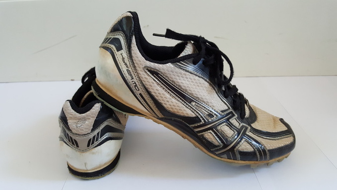 3. Asicsin mustavalkoiset yleispiikkarit. Koko 37. Valkoiset osat ovat ottaneet väriä pituushyppypaikan hiekasta, muuten hyvässä kunnossa. Hintapyyntö: 15 € (puh. 0442136195)
