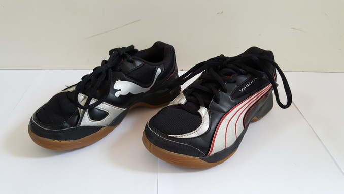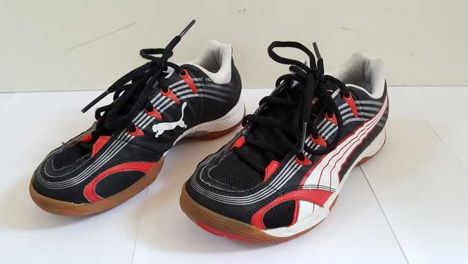 7. Puman mustavalkopunaiset sisäpelikengät. Koko 34. Kengissä vaalea pohja. Todella hyväkuntoiset, ei mitään käytön jälkiä. Hintapyyntö: 20 € (puh. 0442136195)
