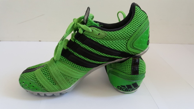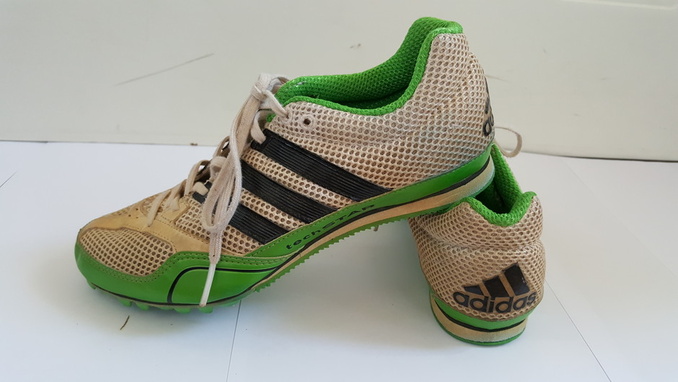 4. Adidaksen valkovihreät yleispiikkarit. Koko 38. Valkoiset osat ovat ottaneet väriä pituushyppypaikan hiekasta, muuten hyvässä kunnossa. Hintapyyntö: 15 € (puh. 0442136195)